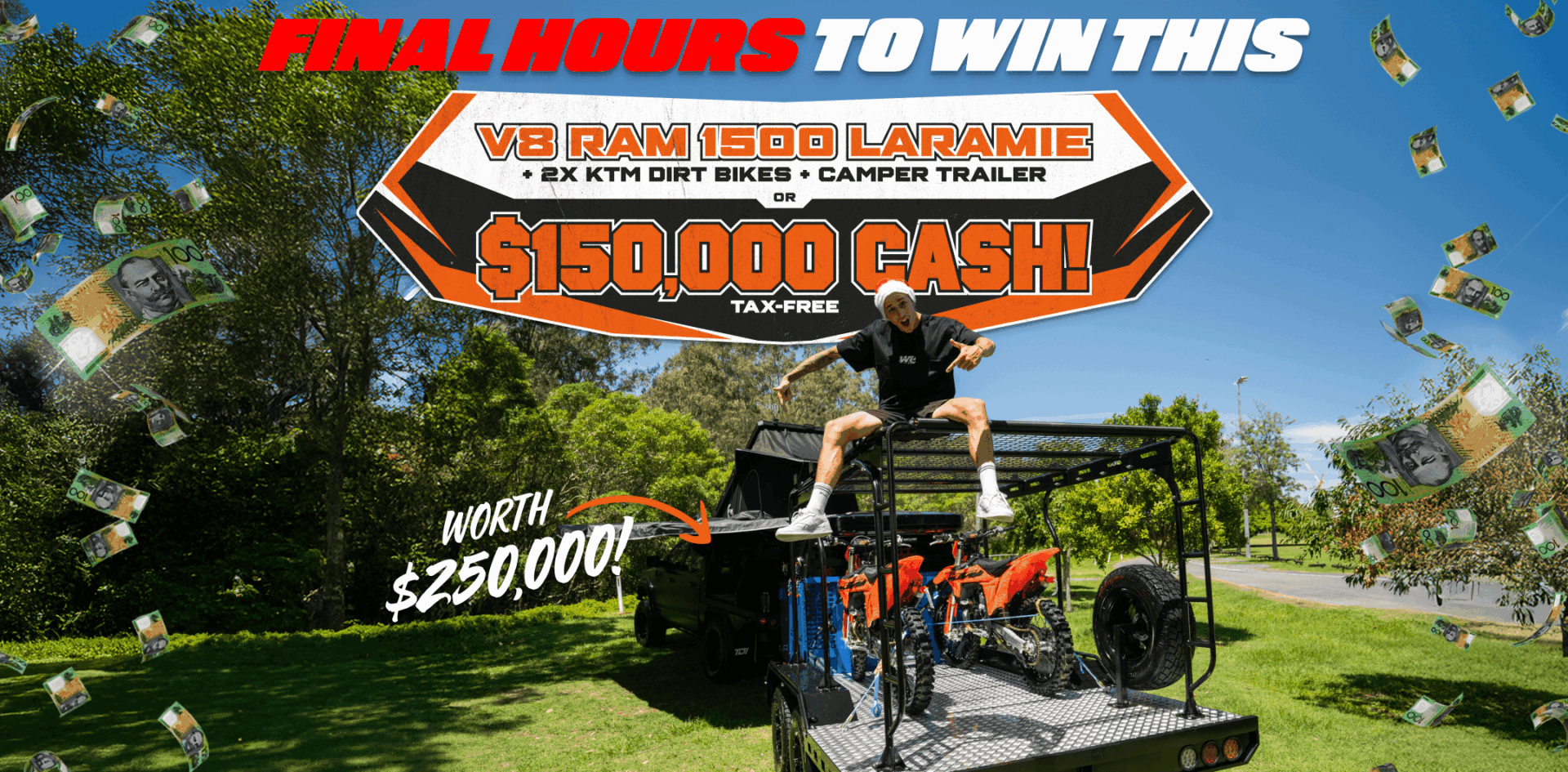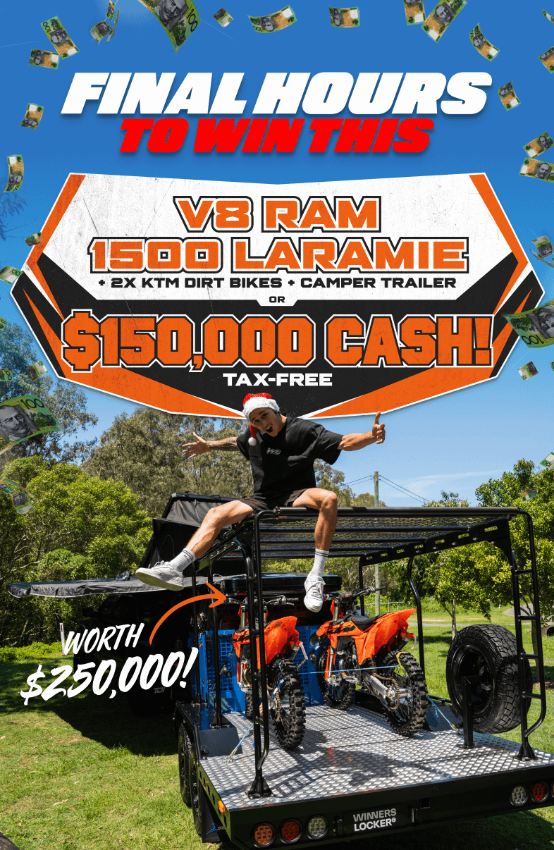Step into the ultimate adventure lifestyle with the RAM 1500 Laramie Sport Giveaway. This powerhouse V8 Hemi ute is built for those who live to explore — delivering commanding performance, rugged capability, and premium comfort in every kilometre. Paired with a fully loaded X-Series camper trailer and two new 2025 KTM 300 SX dirt bikes, this $250K prize pack gives you everything you need to chase the horizon your way. Whether you’re carving through dirt tracks, setting up camp in the wild, or hitting the highway with serious towing muscle, this setup is engineered for limitless exploration.