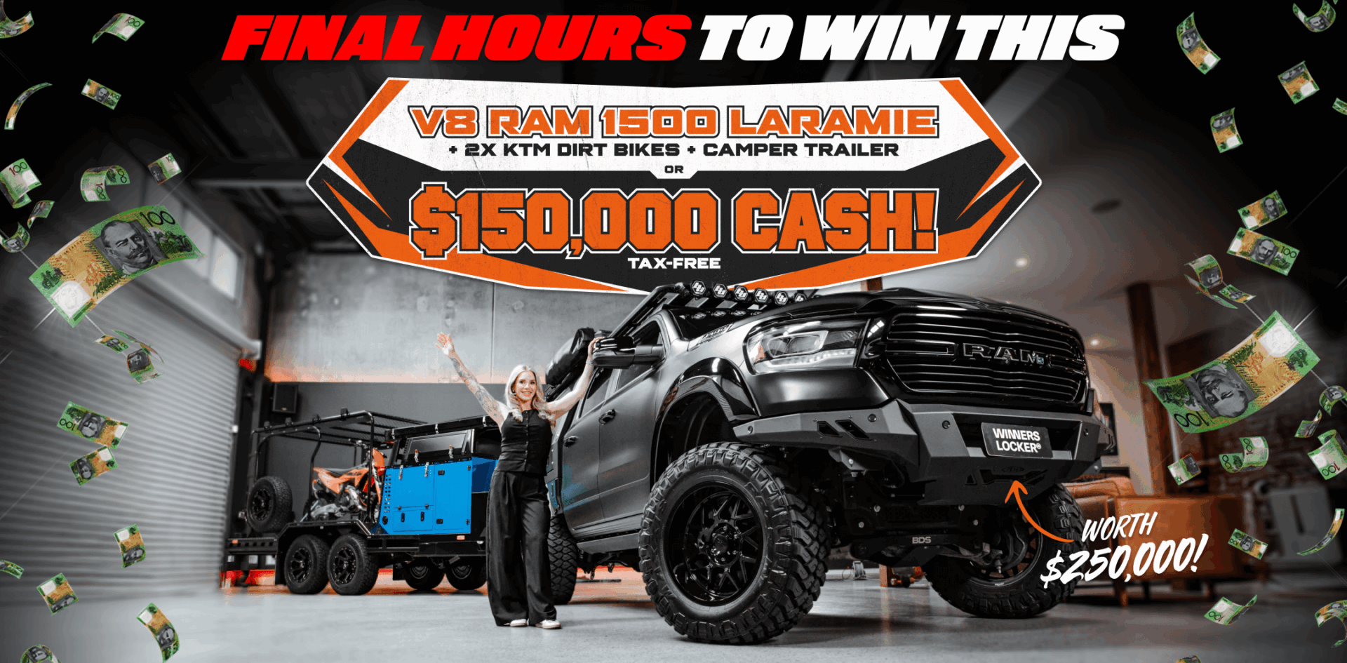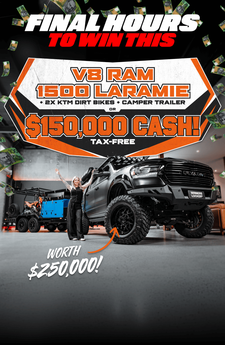 Step into the ultimate adventure lifestyle with the RAM 1500 Laramie Sport Giveaway. This powerhouse V8 Hemi ute is built for those who live to explore — delivering commanding performance, rugged capability, and premium comfort in every kilometre. Paired with a fully loaded X-Series camper trailer and two new 2025 KTM 300 SX dirt bikes, this $250K prize pack gives you everything you need to chase the horizon your way. Whether you’re carving through dirt tracks, setting up camp in the wild, or hitting the highway with serious towing muscle, this setup is engineered for limitless exploration.